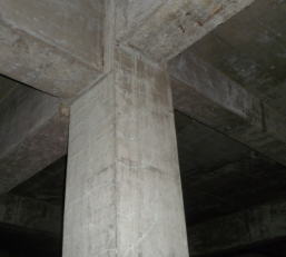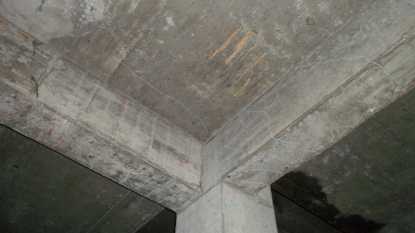 我所技術(shù)人員于2013年7月赴現(xiàn)場(chǎng)進(jìn)行了檢測(cè),檢測(cè)結(jié)果表明,車庫(kù)中心位置上浮位移值最大,上浮后柱底最大高層超過(guò)20cm??蚣苤谏细∥灰飘a(chǎn)生的附加軸力及附加彎矩的作用下,產(chǎn)生了開(kāi)裂及壓碎現(xiàn)象(圖3、圖4)。框架梁端側(cè)面部出現(xiàn)了剪切斜裂縫、梁端底部出現(xiàn)水平裂縫(圖5),特別是車庫(kù)與高層住宅交界位置,梁端開(kāi)裂較為明顯。在車庫(kù)頂梁板與車庫(kù)外周擋土墻交界位置處附加彎矩的作用下,除梁端裂縫外,擋土墻在梁底標(biāo)高以下位置出現(xiàn)通長(zhǎng)水平裂縫。沿車庫(kù)平面跨中位置車庫(kù)平面縱向,車庫(kù)頂板出現(xiàn)兩條通長(zhǎng)裂縫;車庫(kù)入口處沿車庫(kù)平面橫向,車庫(kù)頂板同樣出現(xiàn)兩條通長(zhǎng)裂縫,頂板裂縫均與上浮位移較大軸線相對(duì)應(yīng)。