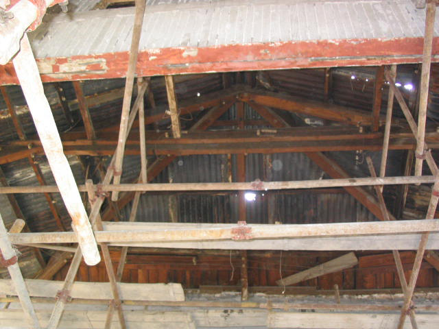 小廣寒影劇院保護性修繕工程,主要包括以下內(nèi)容:磚石墻體雙向鋼筋網(wǎng)加固,鋼柱、鋼梁除銹防護性補強,本屋架加固、更換,看臺修整,屋面鐵皮更換100厚深灰色復(fù)合鋼板屋面,影劇院外觀大修修復(fù)工作。