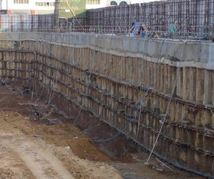通過(guò)對(duì)各道工序的嚴(yán)格控制,基坑經(jīng)過(guò)1個(gè)多月的順利完工。基坑開(kāi)挖過(guò)程中對(duì)每層的錨索施工過(guò)程按照規(guī)范和設(shè)計(jì)要求進(jìn)行拉拔試驗(yàn),拉拔試驗(yàn)結(jié)果表明每道錨索的承載力實(shí)際值與設(shè)計(jì)值比較接近,說(shuō)明設(shè)計(jì)參數(shù)的取值比較合理?;娱_(kāi)挖完畢后,基坑范圍內(nèi)所有觀測(cè)點(diǎn),最大側(cè)向變形為13.3mm,大部分側(cè)向變形觀測(cè)點(diǎn)小于10mm,基坑周?chē)缆纷畲蟪两禐?mm,未見(jiàn)任何異?,F(xiàn)象,整個(gè)基坑所有觀測(cè)點(diǎn)的變形值趨于穩(wěn)定