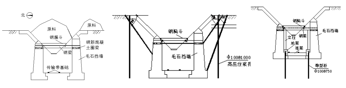 在地下通廊結(jié)構(gòu)中,鋼漏斗內(nèi)鐵礦原料通過鋼梁對(duì)毛石擋墻施加豎向力。由于鋼漏斗內(nèi)原料高度經(jīng)常大于設(shè)計(jì)高度,使得毛石墻受到來自鋼漏斗較大的恕向壓力,造成毛石墻的基礎(chǔ)下沉,為了避免毛石墻基礎(chǔ)進(jìn)一步下沉,需要對(duì)其進(jìn)行加固處理。地下通廊皮帶槽與毛石墻體之間的最大距離約1.5m,最小距離0.5m,機(jī)械設(shè)備無法進(jìn)行施工,同時(shí)整個(gè)加固施工期間不能影響生產(chǎn)的正常運(yùn)行,經(jīng)過多方論證,決定采用人工成孔的微型樁(樹根樁)對(duì)毛石擋墻基礎(chǔ)進(jìn)行托換處理。通過增加的鋼筋混凝土立柱、地梁和微型樁組成的豎向受力體系分擔(dān)來自鋼梁的壓力(圖7),減小毛石擋墻所受的豎向力,從而減小其沉降。