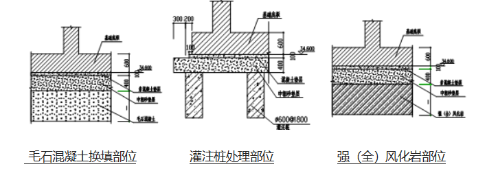 基于以上考慮,經(jīng)過(guò)我單位反復(fù)論證,提出了剛性樁的柔性用法,即東側(cè)仍然采用鉆孔灌注樁,但樁頭不與基礎(chǔ)連接,而是在筏板基礎(chǔ)下做400mm厚的砂墊層。若基底標(biāo)高至全風(fēng)化巖層頂部厚度小于1.0m,則通過(guò)開(kāi)挖并換填C15毛石混凝土進(jìn)行地基處理,否則通過(guò)二次壓漿灌注樁進(jìn)行地基處理,同時(shí)對(duì)樁間土采用高壓選噴樁進(jìn)行處理。采用通過(guò)墊層調(diào)節(jié)三個(gè)單元的不均勻沉降,使其沉降均勻,對(duì)該建筑物的沉降觀測(cè)結(jié)果表明經(jīng)過(guò)這種方式處理后的建筑物地基沉降均勻,從而驗(yàn)證該剛性樁柔性用法是成功的。