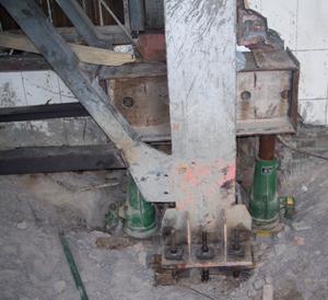 由于礦井凍結(jié)法施工造成后期井口附房產(chǎn)生較大沉降,影響了上部結(jié)構(gòu)的使用。采用頂升法對(duì)鋼結(jié)構(gòu)廠房中的沉降較大的鋼柱進(jìn)行糾偏,該方面需要在鋼柱腹板上焊接鋼牛腿提供頂升支點(diǎn),同時(shí)對(duì)鋼柱底部預(yù)埋的螺栓桿體加長(zhǎng),每個(gè)鋼柱兩側(cè)設(shè)置兩個(gè)頂升千斤頂,經(jīng)過頂升糾偏后該鋼結(jié)構(gòu)廠房基本恢復(fù)原狀。