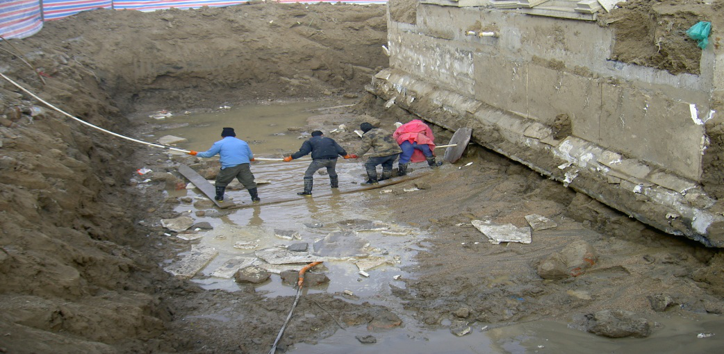 (4)在基礎(chǔ)墊層底面以下0.3m設(shè)置水平掏土孔,掏土孔水平間距為0.5~1.0米;掏土孔水平深度根據(jù)各樓的傾斜情況及荷載重心位置綜合確定。采用射水法加快掏土糾偏的速度,見圖17。掏土的遍數(shù)根據(jù)現(xiàn)場觀測情況確定。經(jīng)過20天的糾傾施工,經(jīng)測量,建筑物的傾斜滿足規(guī)范要求。