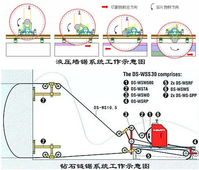 柱截斷采用鉆石鏈鋸系統(tǒng);墻體截斷采用半自動推進式墻鋸系統(tǒng)。