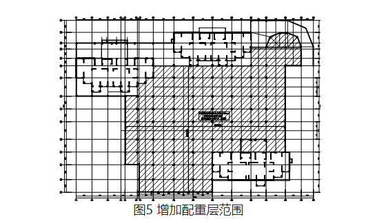 根據(jù)建筑完工后總平面中的場地最低點,抗浮設(shè)計水頭按4.5m對車庫部分結(jié)構(gòu)進行復核驗算,復核驗算內(nèi)容包括整體抗浮計算和局部抗浮計算。結(jié)合驗算結(jié)果及現(xiàn)場檢測情況,在車庫現(xiàn)有地面上增設(shè)20cm厚混凝土層,如圖5中陰影所示。