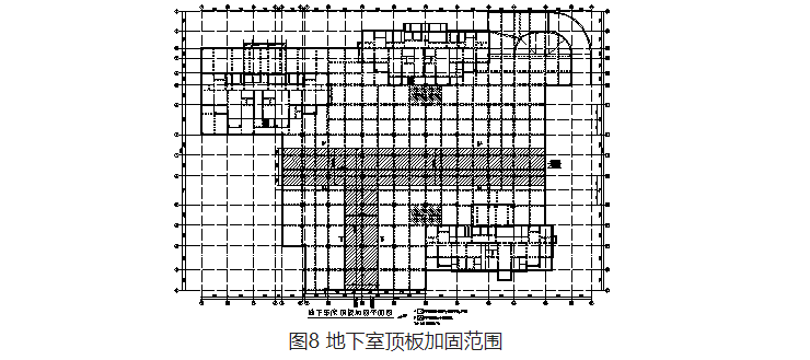 車庫頂板東西向存在兩條通長大裂縫,南北向也有兩條較長裂縫。將裂縫區(qū)域的板加厚10cm,即在板頂增設(shè)10cm鋼筋混凝土層,對板進行加固,同時提高梁端截面的承載力,加固范圍見圖8。對底部開裂的板,灌縫后采用粘貼碳纖維方法進行加固。
