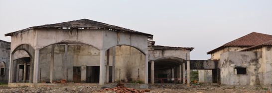 伊豐度總統(tǒng)行宮項(xiàng)目為2006年剛果(布)國慶配套工程,占地101200m2,由一個(gè)主樓加上兩個(gè)單層別墅組成。其中1#主樓建筑面積為2700 m2,主體為一層、局部二層,一層層高約為5米,大廳處層高約為8米,結(jié)構(gòu)形式為混凝土柱、梁及150厚空心砌塊墻承重,木屋頂結(jié)構(gòu)(局部現(xiàn)澆板屋頂),見圖32~35。現(xiàn)大部分圖紙缺失,混凝土強(qiáng)度等級(jí)、砌體材料強(qiáng)度等級(jí)不詳。該國建筑物不考慮抗震設(shè)防要求。2006年由本地建筑單位承建,由于各種原因中途停工至今,現(xiàn)剛果(布)大工委指派威海國際經(jīng)濟(jì)技術(shù)合作股份有限公司進(jìn)行維修與續(xù)建,項(xiàng)目組對(duì)現(xiàn)狀進(jìn)行勘察后發(fā)現(xiàn)該工程施工質(zhì)量差,且長時(shí)間暴曬雨淋導(dǎo)致屋架腐爛、梁柱板鋼筋嚴(yán)重銹蝕,存在重大安全隱患,為保證結(jié)構(gòu)安全,委托我所對(duì)該工程進(jìn)行鑒定并出具加固方案。